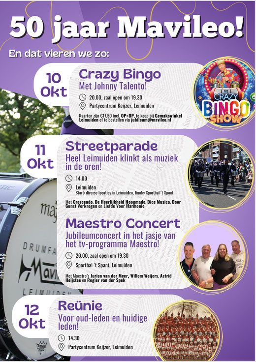 Drumfanfare Mavileo (Leimuiden) organiseert op 11 oktober een street parade om haar 50ste verjaardag te vieren.
